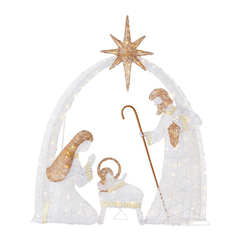 This giant led lighted nativity scene from home accents holiday is constructed with a durable metal frame covered by a pvc tinsel coating to shine both day and night. For use indoors or outdoors. Tall display features 440 lights expertly arranged on the sculpture to create the optimal lighting effect sure to brighten your yard all season long.